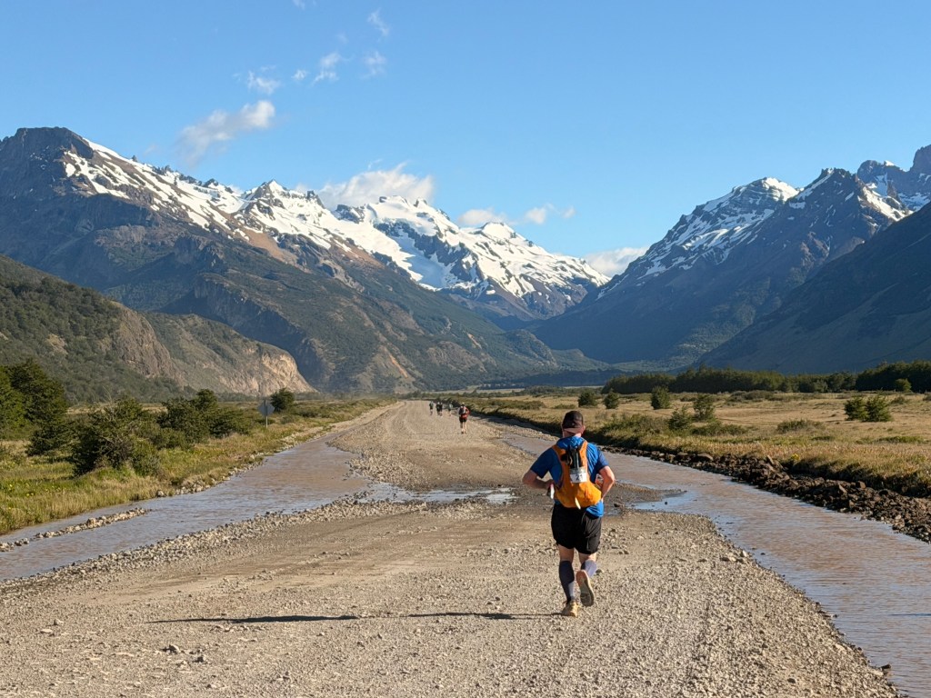The first stage was 36km of stunning trails with 930m of climbing. Fitzroy and Cerro Torre were the focus of the day as we left town on a gravel road to sweep round from the south of the mountains to approach from the north. Everyone was raring to go, and set off down the 16km towards the first support stop.