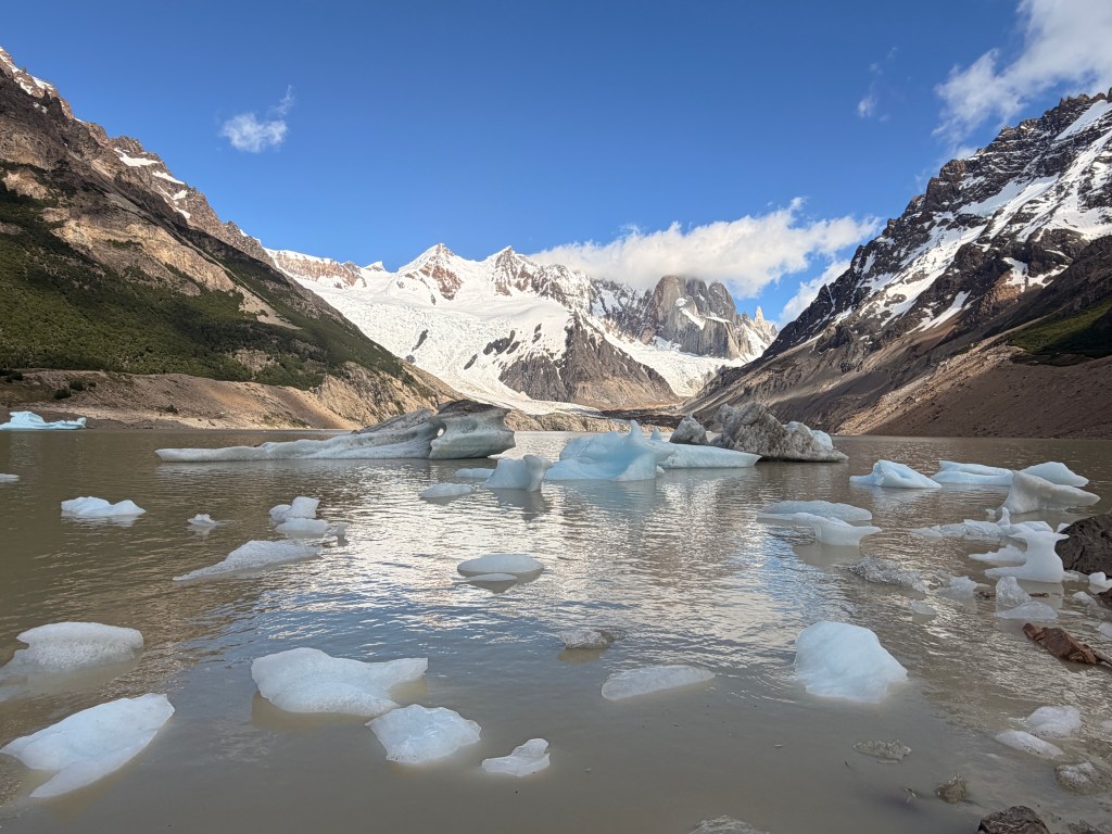 Upon reaching the top of the moraine we were offered views of a stunning lake with chunks of glacial ice floating in it.